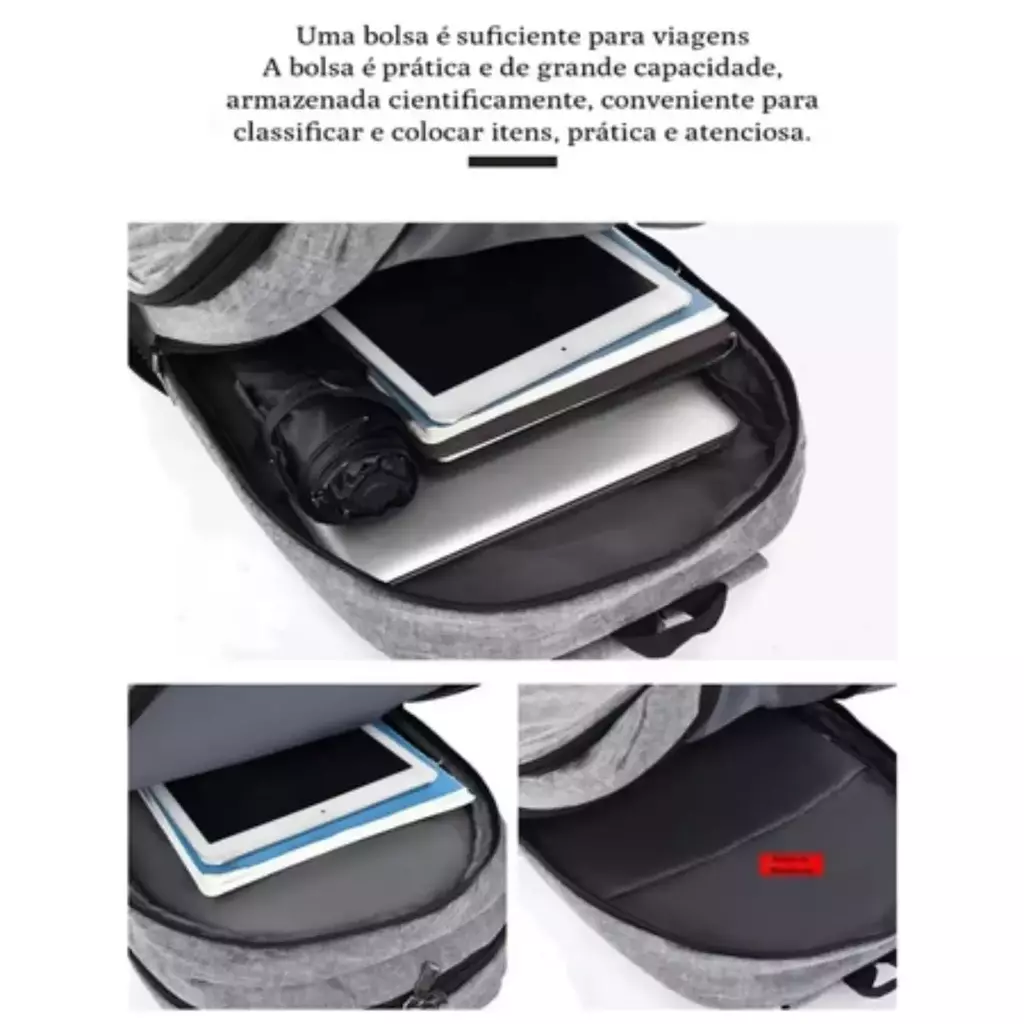 Mochila: Com grande capacidade, ideal para carregar todos os seus itens essenciais, seja para o trabalho, estudos ou viagens. Possui compartimentos bem distribuídos, incluindo espaços específicos para notebook, celular, livros e objetos pessoais, garantindo fácil acesso e organização.